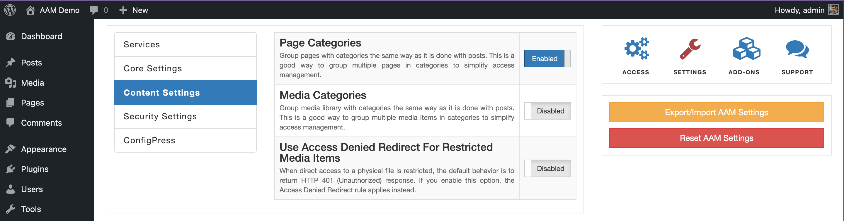Allow grouping of the regular WordPress pages into categories. If enabled, you can start creating custom categories for pages and manage access to the group of pages through these categories.